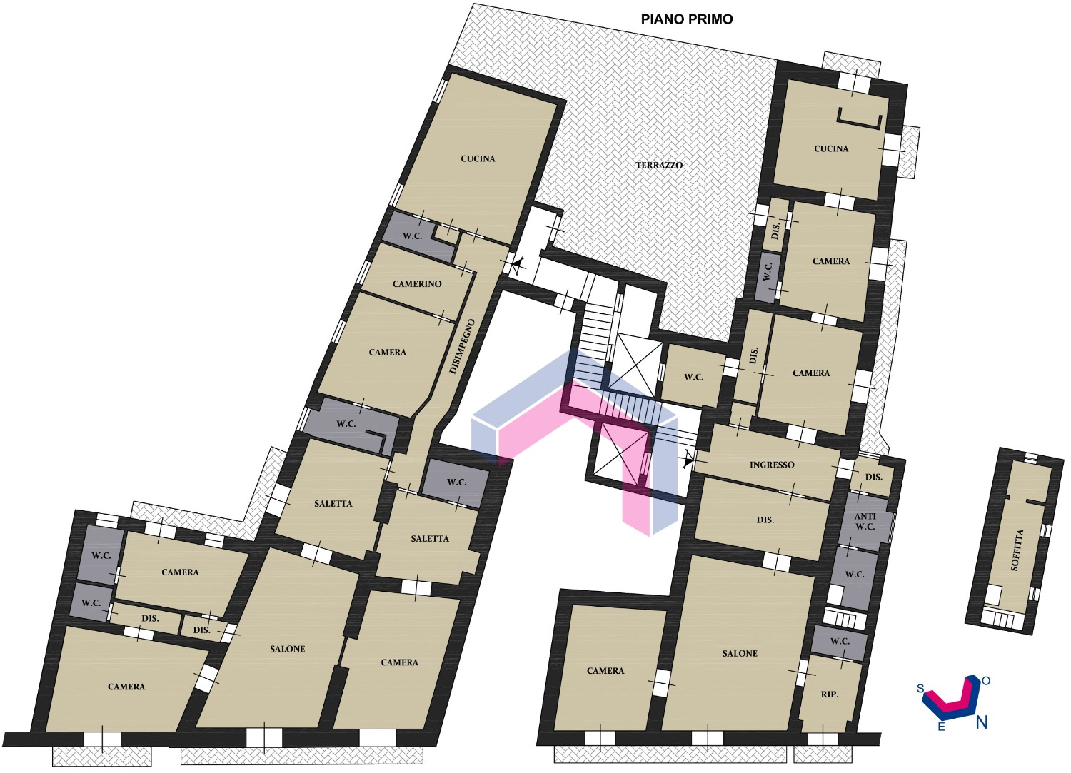 Via Maqueda tratto Quattro Canti – Teatro Massimo, di fronte via Napoli e la Galleria delle Vittorie. 2 esclusivi appartamenti di complessivi 13 vani, 500 mq, impreziositi da un ampio terrazzo 100 mq, posti al 1° piano di un prestigioso edificio di fine ‘600, di soli due piani fuori terra.